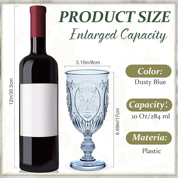 • Plastic Blue Goblet Set: you will receive a set of 36 plastic blue goblets, each with a capacity of 10 ounces; The bright and charming blue color adds a unique touch to various occasions; Whether as party decorations or the perfect gift for weddings or other special events, this goblet set will add a touch of elegance and joy to your celebrations