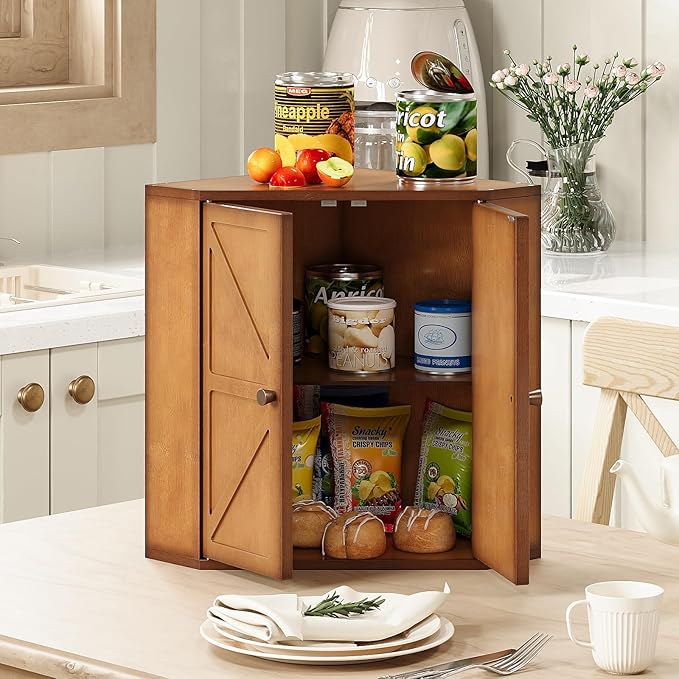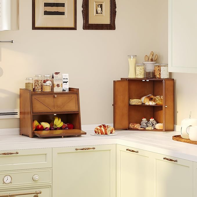 • Large Capacity:Our corner bread box with 2 layers of 16.9”L x 11.2”W x 16.5”H board are large enough to hold 2 large loaves of bread, rolls, muffins, and more. Flat top design,any kitchen items you want can be placed on the bread box. It can save your space and meet the needs of your family.
