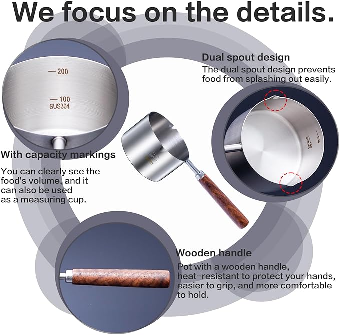 • Thoughtful Design: Dual pouring spouts for both right- and left-handed use, preventing spills when pouring butter, milk, coffee, or chocolate. The wooden handle keeps your hand safe from burns.