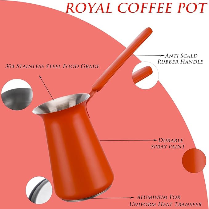 • STAINLESS STEEL MATERIAL: Crafted from high-quality food-grade 304 stainless steel, this Stainless Steel Turkish Coffee Pot is built to last. It’s rust-resistant, easy to clean, and withstands high temperatures without deformation. The ergonomic rubber handle ensures a comfortable grip and protects against burns, making it a safer choice compared to traditional copper Turkish coffee pot designs