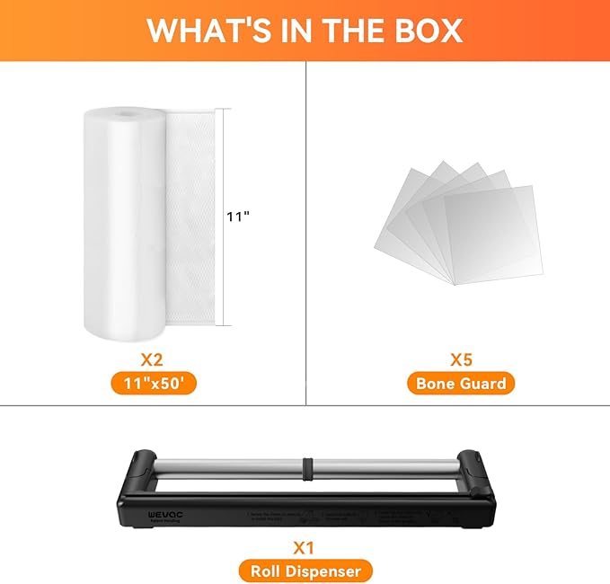 • Extra Roll Dispenser: The bonus Roll Dispenser makes it easy to precisely cut your rolls to the desired size without extra tools. This roll dispenser is compatible with all rolls of bags under the Wevac brand and can provide a good user experience. It is not recommended to use rolls of bags with cores that are too small.