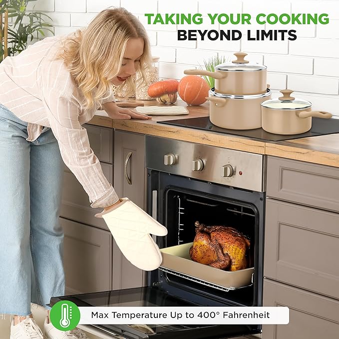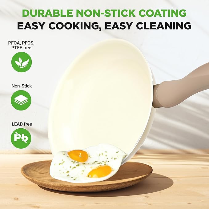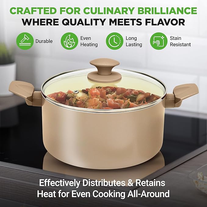 • EFFORTLESS COOKING AND CLEANING - The ceramic non-stick coating ensures food releases easily, reducing cleanup time. This non stick pots and pan set also features even heat retention for consistent, high-quality cooking results.