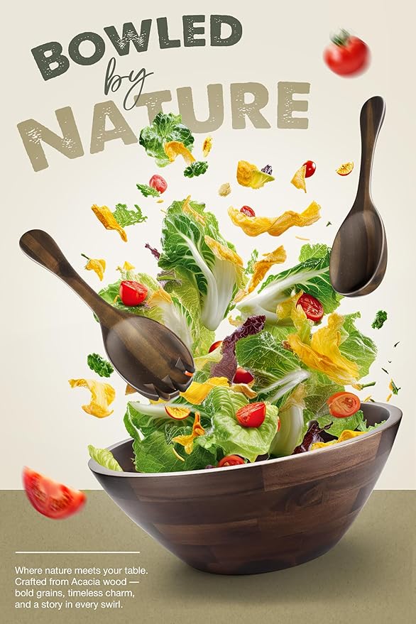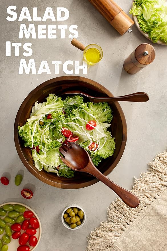 • Crafted from Acacia Wood: Handcrafted from solid acacia wood with a deep walnut finish, this wooden salad bowl set offers exceptional durability and timeless beauty. Each acacia wood bowl showcases unique wood patterns, making it perfect for both everyday meals and special gatherings