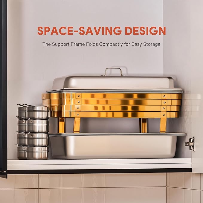 • Foldable for Compact Storage: Our chafing dishes for buffet take up little space when not in use thanks to their foldable legs and stackable pans, allowing for easy storage, organization, and transport from shelf to table