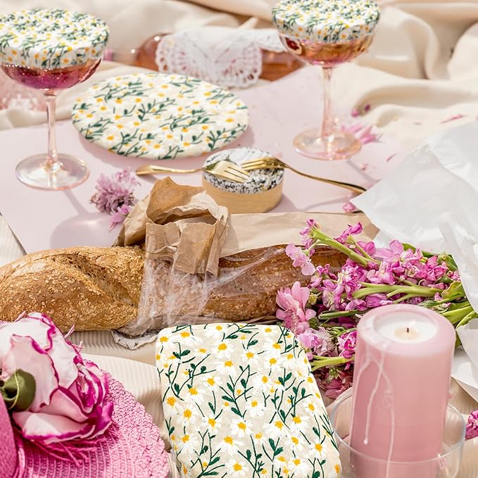 Patelai 10 Pcs Bowl Covers Reusable in 5 Size Stretch Cloth Fabric Elastic Food Storage Bowl Covers Bread Sourdough Lids for Proofing Food Fruits Leftover(Chrysanthemum)