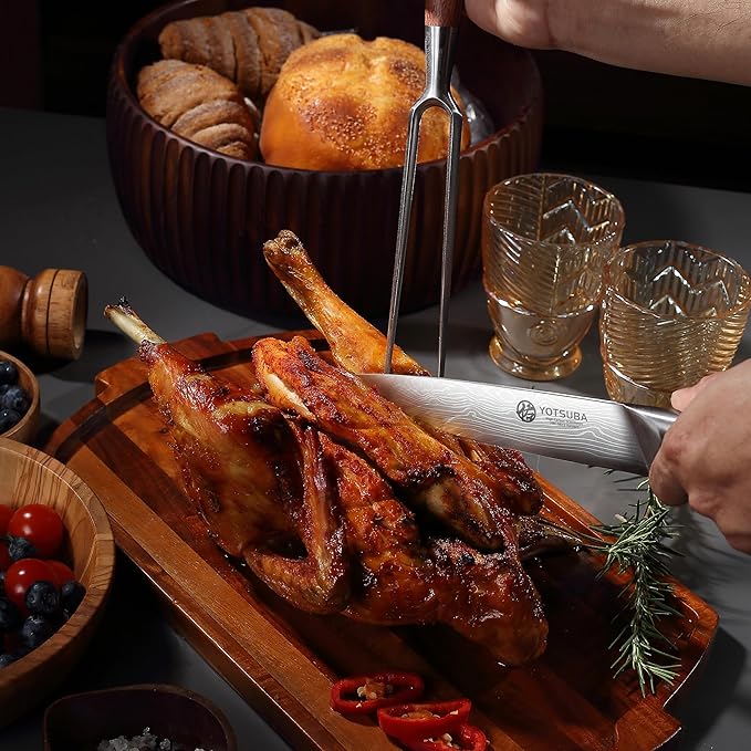 • ERGONOMICALLY WOOD HANDLE :This kitchen carving knife set features an ergonomic rosewood handle that provides a comfortable, non-slip grip. YOTSUBA slicing knife handle's natural wood grain makes each slicing knife unique, while the metal frame design and colored nail ensure good stability and balance