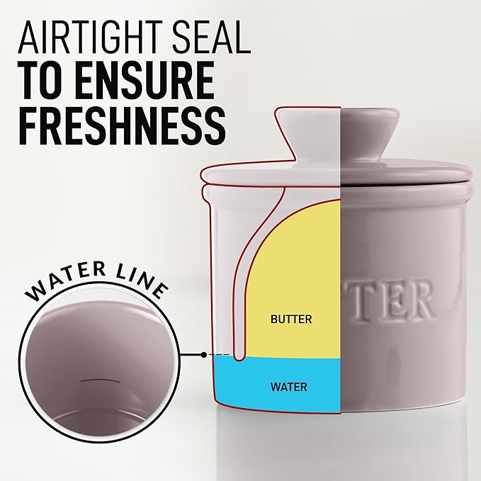 • AIRTIGHT FRESHNESS: Our porcelain butter crock keeps your butter fresh by using a water-filled base that creates an airtight seal. The bell of this butter crock comfortably holds a whole stick, ensuring you always have delicious, spreadable butter on hand.