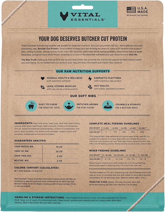 • SOFT NIBS FREEZE-DRIED RAW BEEF & SALMON DOG FOOD: Vital Essentials Freeze Dried Soft Nibs Dog Food packs more protein than industry standard into every soft bite to deliver the peak vitality your dog deserves, especially when compared to dehydrated dog food. This complete and balanced freeze-dried raw dog food is made with premium Butcher Cut beef and salmon, responsibly sourced in the USA.