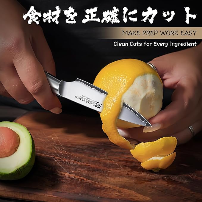 • VG10 Steel Paring Knife---Crafted from premium German VG10 high-carbon steel,the paring knife boasts a Rockwell hardness of 60±2 HRC, ensuring exceptional durability, long-lasting sharpness, and resistance to chipping. Perfect for precision cutting