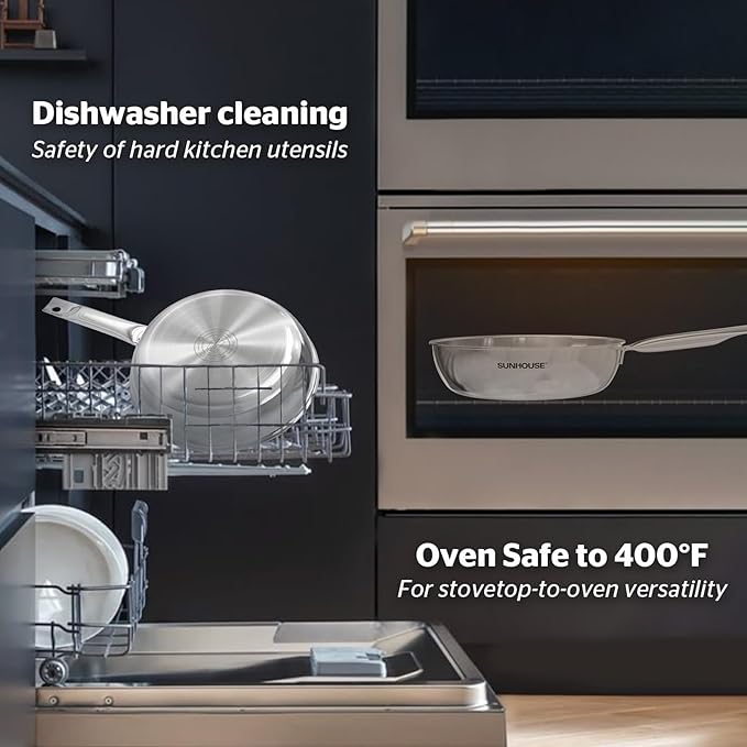 SUNHOUSE 11 Inch Tri-Ply Stainless Steel Frying Pan, Whole-Clad No Coatings Skillet with Stay-cool Handle for Cooking, Durable & Oven Safe to 500°F, Dishwasher Safe, Compatible with All Cooktops