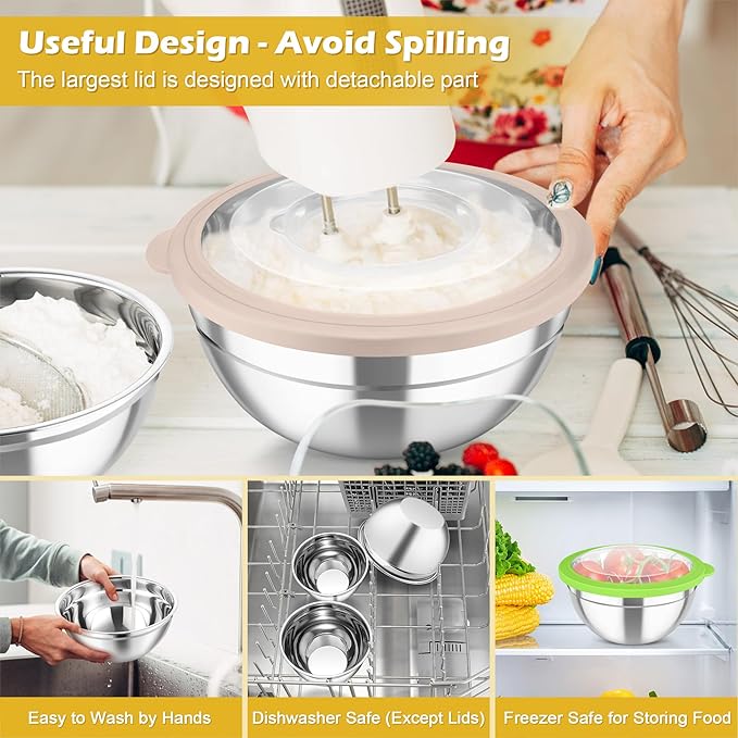 - TRANSPARENT LIDS & 3 GRATERS: Every stainless steel mixing bowl offers a visible clear tight-fitting lid, Easy to see through and identify what’s in the bowl, Leak-proof to prevent liquid spills, Ideal for storing food in freezer to keep it fresh and clean, The largest lid has a detachable section, 3 grater attachments can be simply placed directly on the center of lid for slicing /grating /shredding, Practical for meal-preparing, No need to take away the entire lid to avoid splashing or spilling when whisking