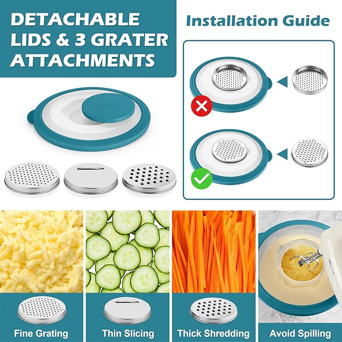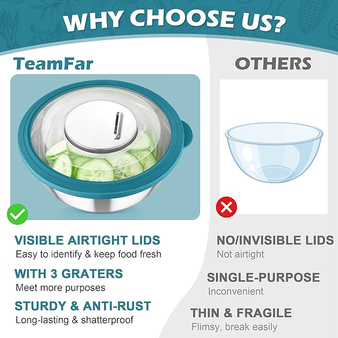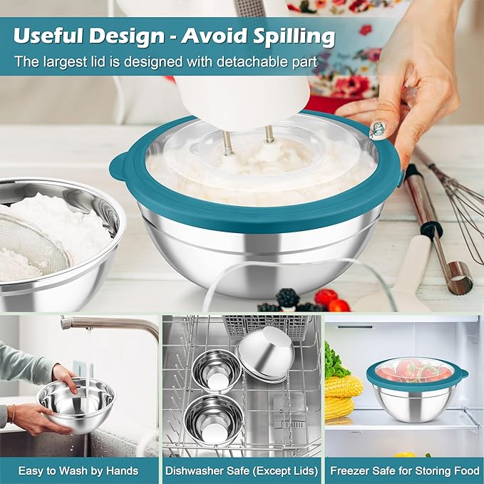 - TRANSPARENT LIDS & 3 GRATERS: Every stainless steel mixing bowl offers a visible clear tight-fitting lid, Easy to see through and identify what’s in the bowl, Leak-proof to prevent liquid spills, Ideal for storing food in freezer to keep it fresh and clean, The largest lid has a detachable section, 3 grater attachments can be simply placed directly on the center of lid for slicing /grating /shredding, Practical for meal-preparing, No need to take away the entire lid to avoid splashing or spilling when whisking