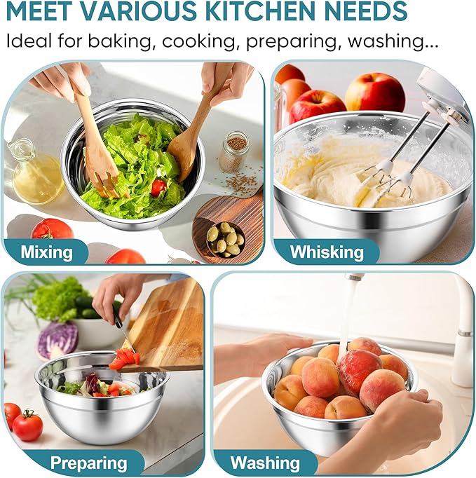 - 3 SIZES & VERSATILE: Comes with 3 different sizes (1.5/3/4.5QT), Ranging from small to large and helpful for you to handle variety of kitchen tasks at the same time, Such as Mixing salads, Beating eggs, Washing fruits, Preparing meals, Kneading dough, Marinating meat, Serving sugar, Storing food and more, Our mixing bowl set is ideal for both indoor and outdoor use for daily meals, gathering, camping, picnics, barbecues...