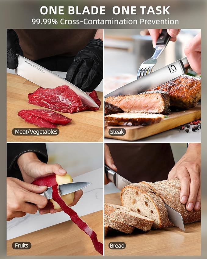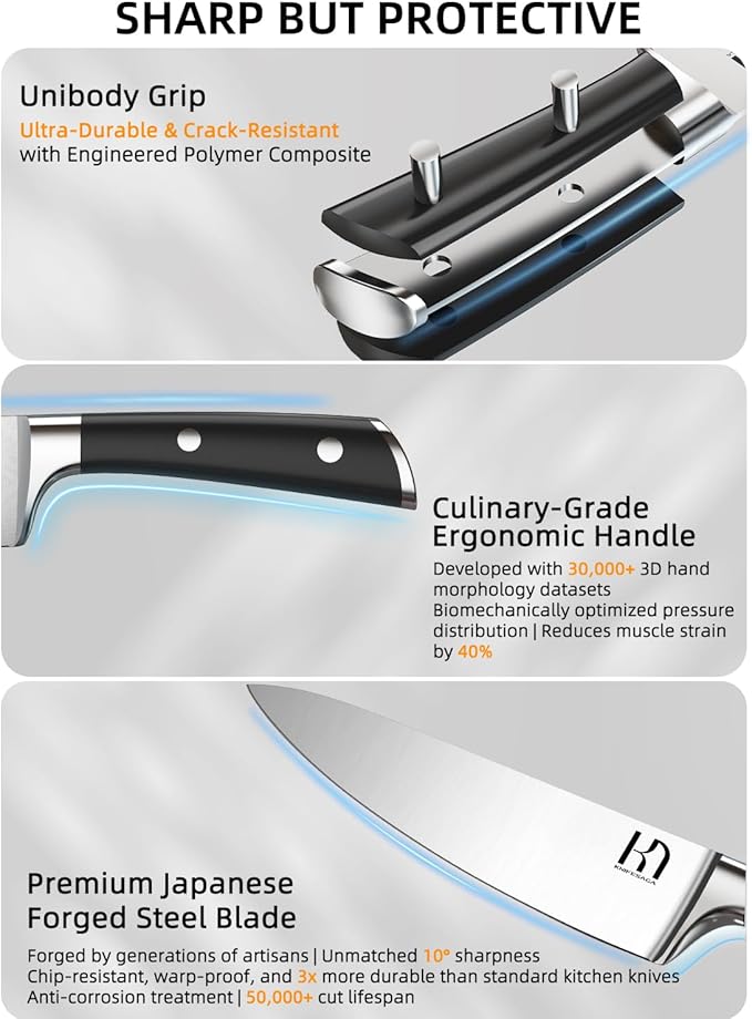 - 【Razor-sharp & Durable · Japanese Steel Craftsmanship】2025 KnifeSaga knife sets utilizes the latest technology to develop revolutionary NextGen forged steel to create professional-grade chipping-resistant blades that are durable and resistant to curling, and kitchen knife sets are 3 times tougher than others. The satin-finished, high carbon stainless steel blades are durable, stain-resistant, and easy to maintain, with a sharpness that lasts over 5 years, so no more frequent sharpening.