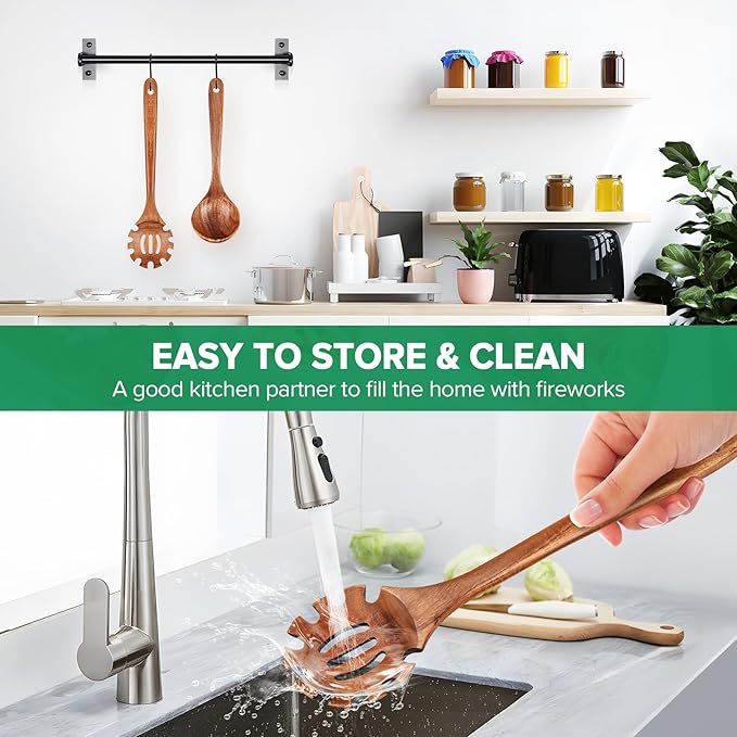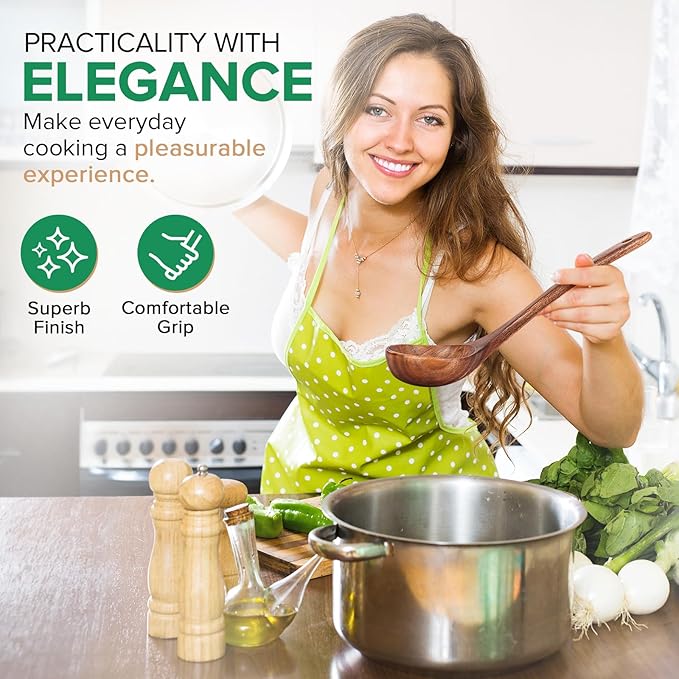 • Premium Material:This wooden soup ladle and wooden spaghetti pasta spoons set is made of food-grade natural teak wood.Non-toxic,no-rust,heat-resistant,bpa-free and healthy kitchen utensils set.Our non-stick wooden spoons for cooking are also lightweight,hard texture,good stability,no crack and won't deform easily.