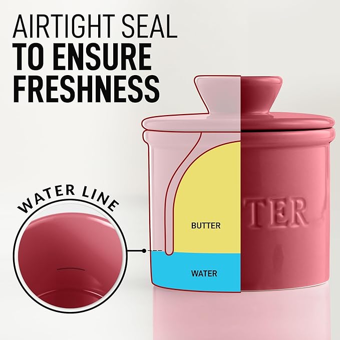 • AIRTIGHT FRESHNESS: Our porcelain butter crock keeps your butter fresh by using a water-filled base that creates an airtight seal. This butter crock comfortably holds a whole stick, ensuring you always have delicious, spreadable butter on hand.