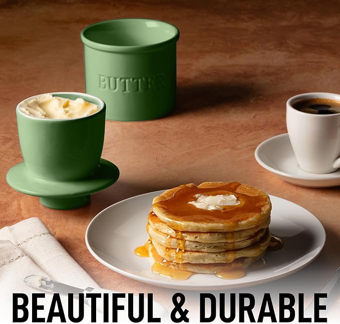 • PERFECTLY SPREADABLE BUTTER: No more waiting for butter to soften! This butter crock keeps your butter at a spreadable temperature, so you can enjoy smooth, easy spreading right when you need it. No one likes wrestling with cold butter on their toast, and this French butter dish ensures a smoother, stress-free breakfast experience.