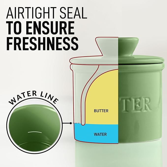 • AIRTIGHT FRESHNESS: Our porcelain butter crock keeps your butter fresh by using a water-filled base that creates an airtight seal. The bell of this butter crock comfortably holds a whole stick, ensuring you always have delicious, spreadable butter on hand.