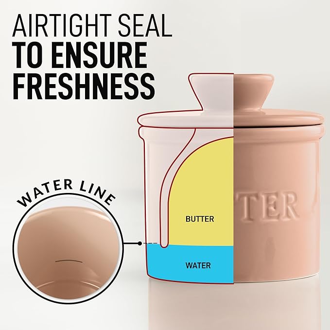 • AIRTIGHT FRESHNESS: Our porcelain butter crock keeps your butter fresh by using a water-filled base that creates an airtight seal. This butter crock comfortably holds a whole stick, ensuring you always have delicious, spreadable butter on hand.
