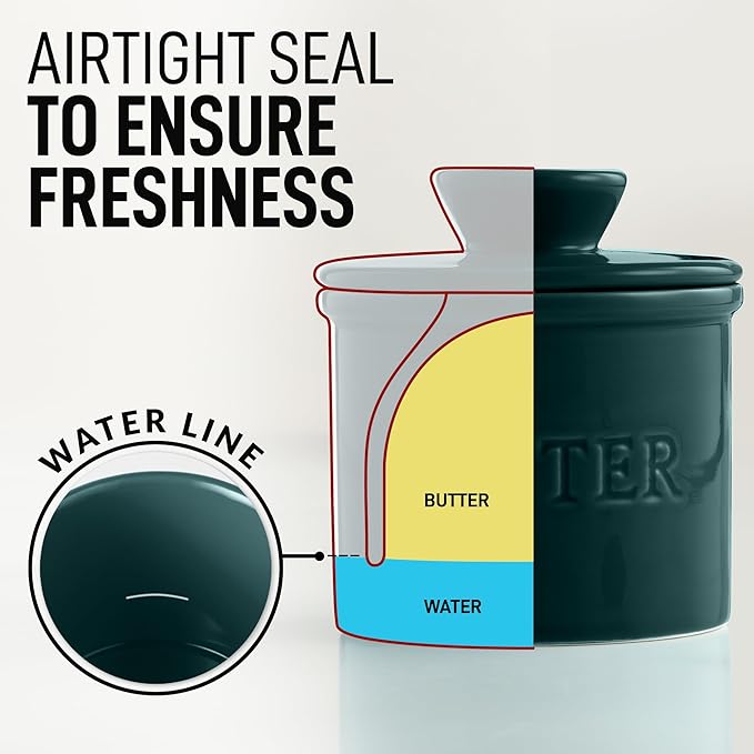• AIRTIGHT FRESHNESS: Our porcelain butter crock keeps your butter fresh by using a water-filled base that creates an airtight seal. The bell of this butter crock comfortably holds a whole stick, ensuring you always have delicious, spreadable butter on hand.