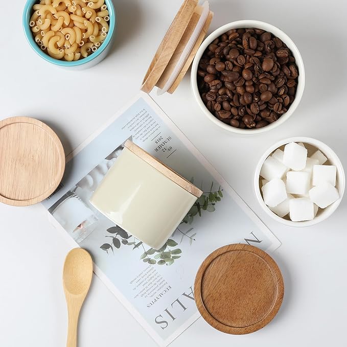 Sweejar Kitchen Canisters Ceramic Food Storage Jar, Stackable Containers with Airtight Seal Wooden Lid for Serving Ground Coffee, Tea, Sugar, Salt and More - 16 Fl Oz (Beige)
