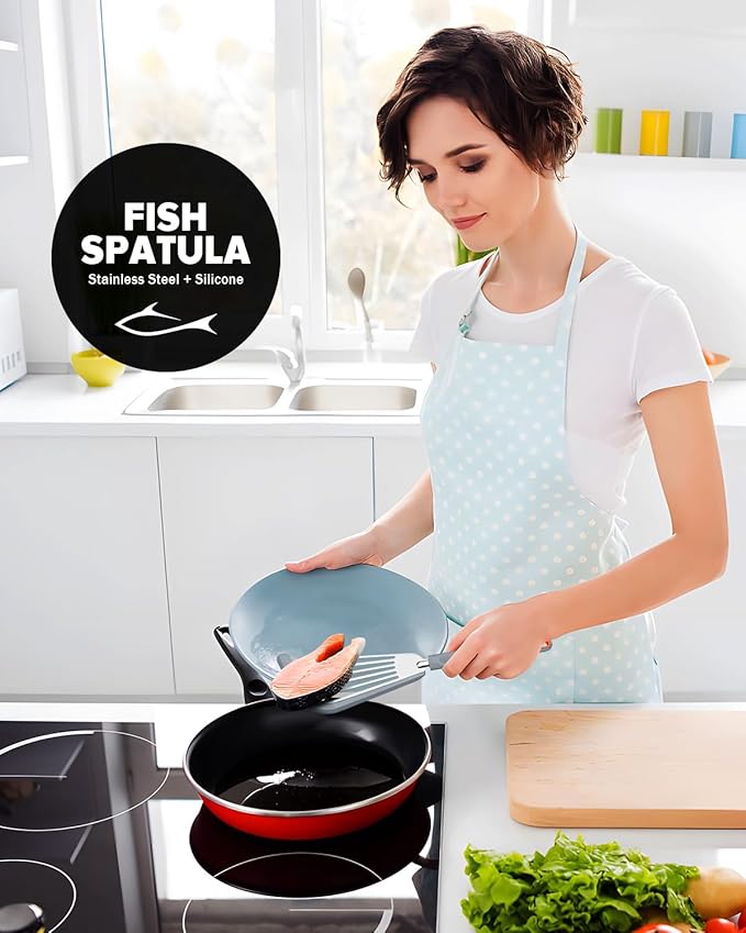 • [Multifunctional Fish Spatula]Spatulas with slotted design, easy to filter the oil out when frying foods, perfect for cooking fish, fillets, steaks, seafood, egg, dumplings, meat and more. Easy used with frying, baking, lifting, turning, or transferring. Enjoy the wonderful process of cooking delicacy with cooking spatulas.