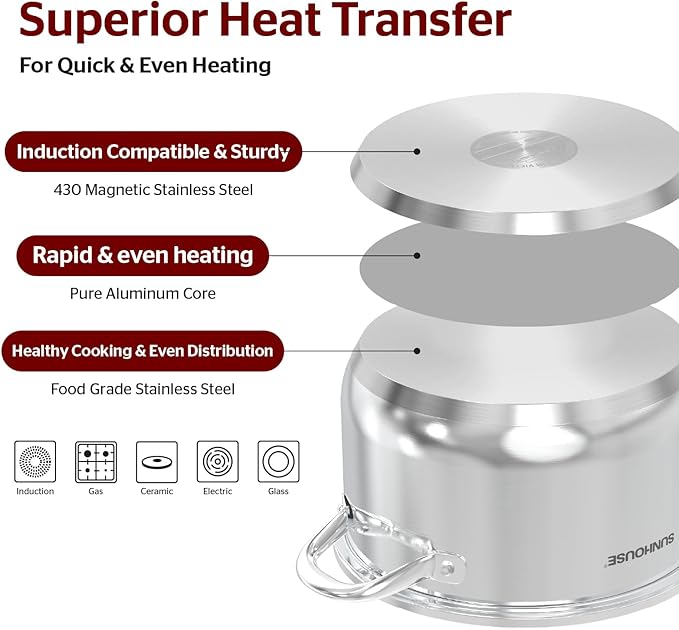 • [Tri-Ply Stainless Steel for Fast Heating] – The 3-ply bonded construction, which alternates layers of stainless steel and aluminum, ensures even heat distribution, preventing hot spots and promoting faster cooking. This design helps save both time and energy.