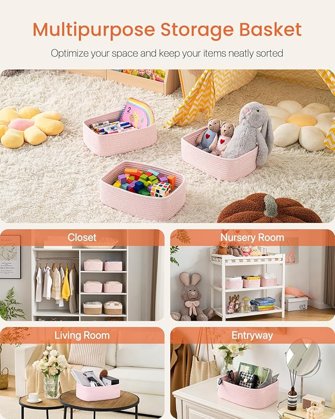 Small Woven Basket, 13.5 x 9.5 x 5 Inches, Storage Basket for Organizing, Cute Small Rope Shelf Closet Cube Storage Bins Baskets for Shelves, Dog Toy Gift Baskets Empty, 3 Pack Light Pink