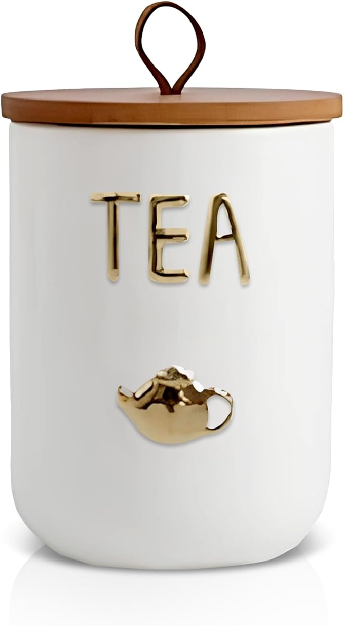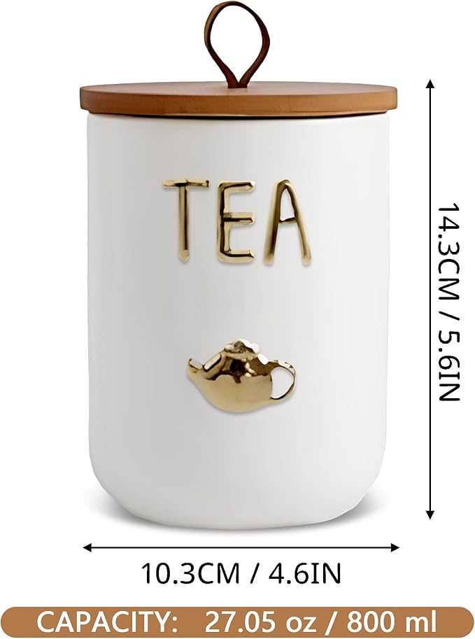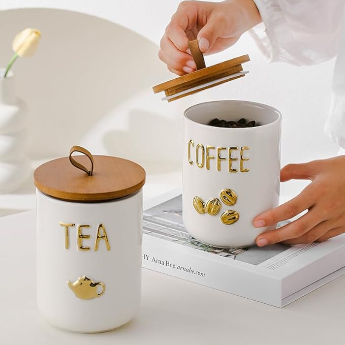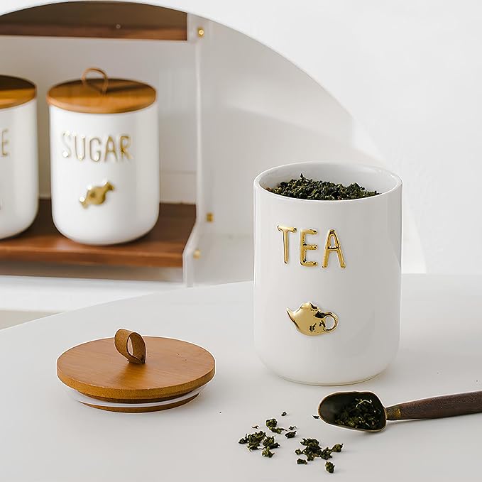 • 【Stylish Design】Tea sugar coffee container set has a creative embossed gold-plated design, which not only makes categorization easier, but also adds a sense of fun atmosphere to your life and adds a touch of sophistication to your kitchen countertop. Hand-polished wooden lid with strap design, comfortable texture, so you can access more convenient.
