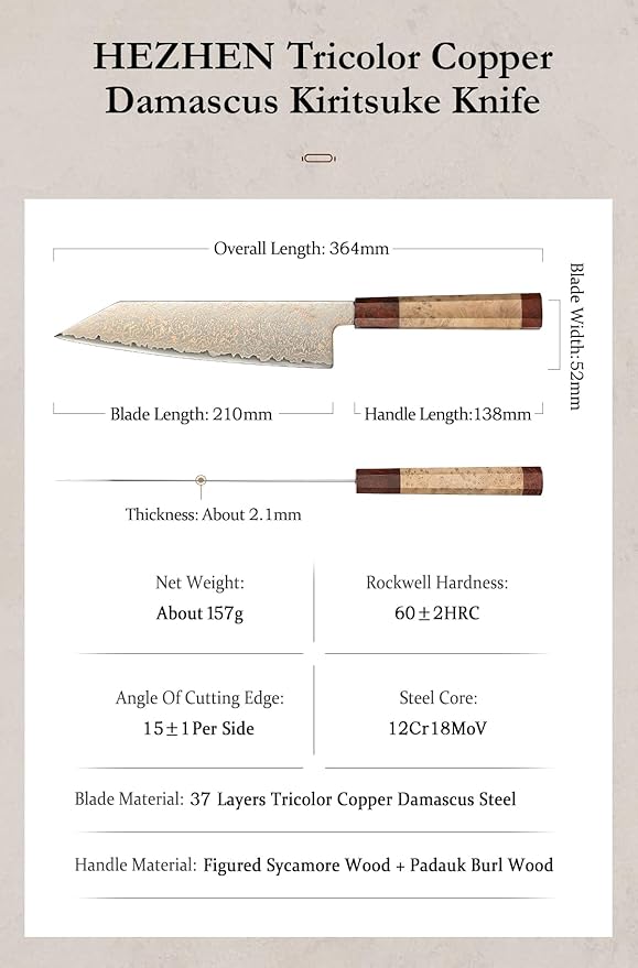 HEZHEN Kiritsuke Chef Knife,8.3 Inch, 37 Layers Tricolor Copper Damascus Steel-Japanese Damascus Knif- Professional Knife for Chefs&Home Cooking-Razor Sharp,Sycamore Wood Handle