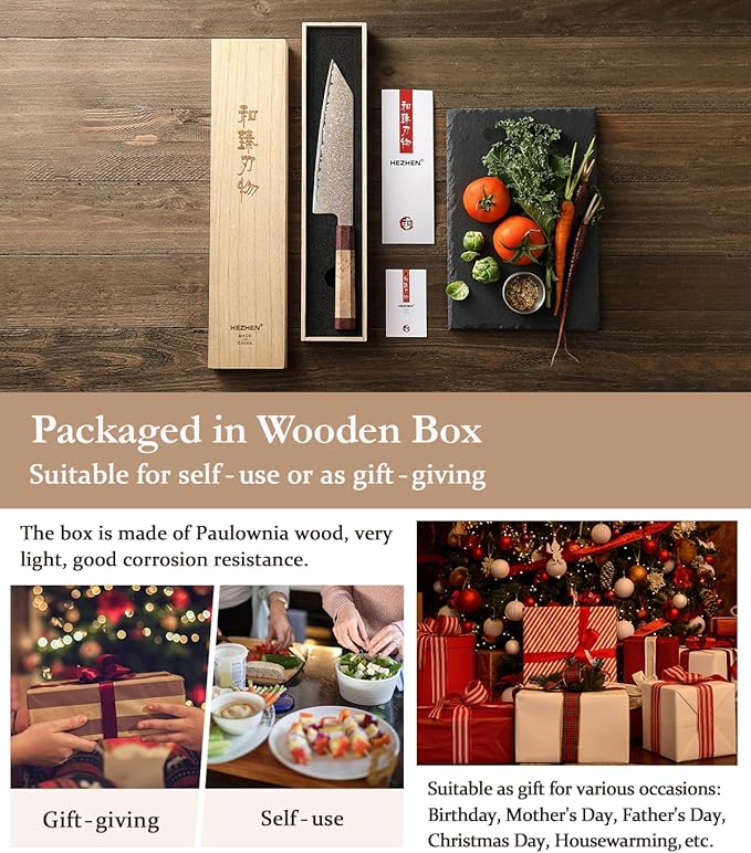• Packaged in a lightweight and corrosion-resistant paulownia wood box, this kiritsuke chef knife is perfect for gifting or personal use; Note that the brass and copper on the blade may oxidize over time when exposed to air—simply wipe with lemon juice to restore its shine; For any questions, our customer service team is here to assist you