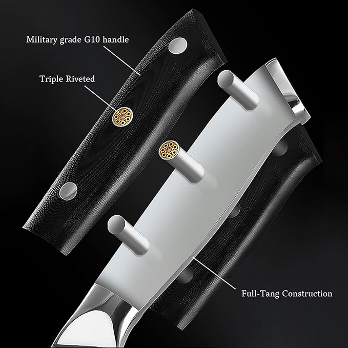 • FULL TANG ERGONOMIC HANDLE - The handle is made of G10 fiberglass, which can withstand cold, high temperature and corrosion, is crack-proof and anti-slip and is very durable. Reinforced by three rivets, the full tang design provides perfect balance and grip