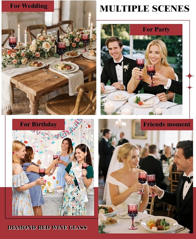 • Multi-occasion use: These 7 Oz disposable burgundy wine glasses can be used in various occasions, such as entertainment events, weddings, bars, or casual gatherings. These plastic wine cups blend seamlessly with tableware. Plastic goblet glasses can not only serve as table decorations but also hold wine, beer, cocktails, juice, and so on.