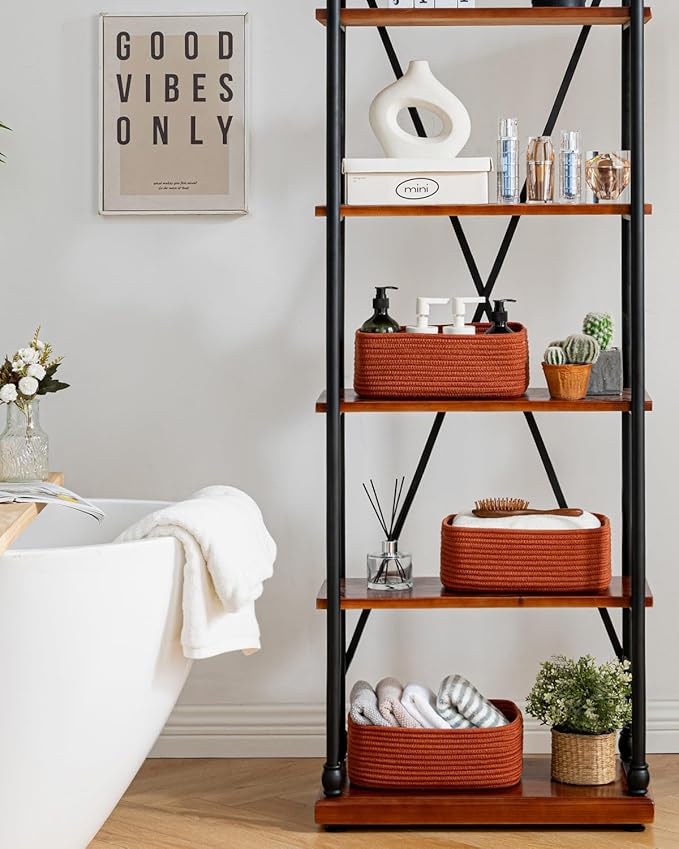 Small Woven Basket, 12 x 8 x 4.5 Inches, Storage Basket for Organizing, Cute Small Rope Shelf Closet Cube Storage Bins Baskets for Shelves, Dog Toy Gift Baskets Empty, 3 Pack Rust Red