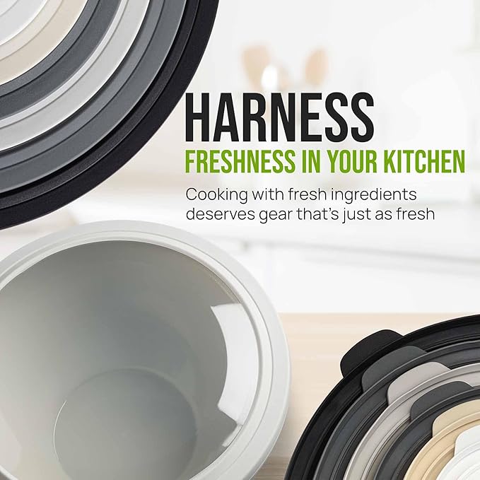 • KEEPS FOOD FRESH: These kitchen mixing bowls come with tight fit lids that prevent the air from getting in and out and also allow transporting food without any spills. The transparent plastic material allows you to take a peek at the food without opening it every time.
