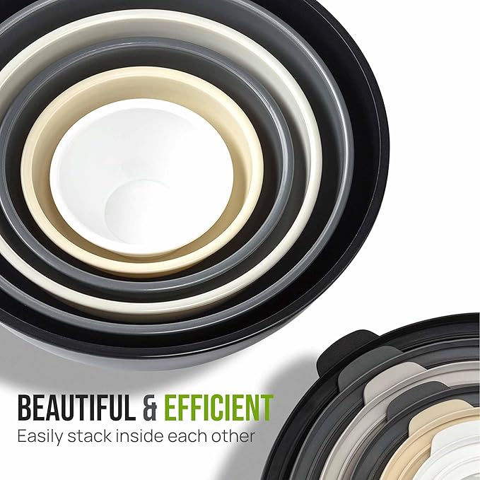 • STACKABLE, EASY TO CLEAN DESIGN: These nesting mixing bowls for kitchen can be stacked on top of each other to save space. The plastic bowls with lids are top-rack dishwasher friendly and can also be hand washed with soap and water (avoid the use of abrasive sponges).