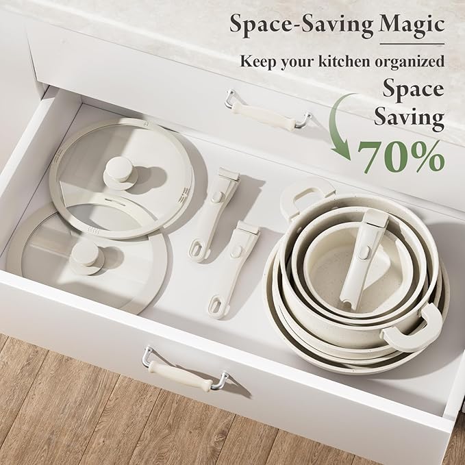 - Optimized Storage Solution: Maximize your kitchen space with the stackable design of our ceramic cookware set, saving up to 70% of space. Whether you’re dealing with limited storage or just looking to stay organized, this space-saving pots and pans set is the ideal solution.