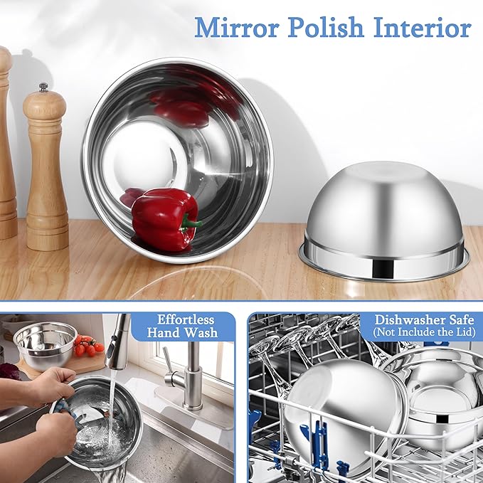 • Dishwasher Safe for Easy Cleaning: with its mirrored polished interior, these stainless steel mixing bowls can be easily cleaned by hand, and are also safe for dishwasher-safe, but it is better to hand wash the lids to prevent deformation caused by high temperature