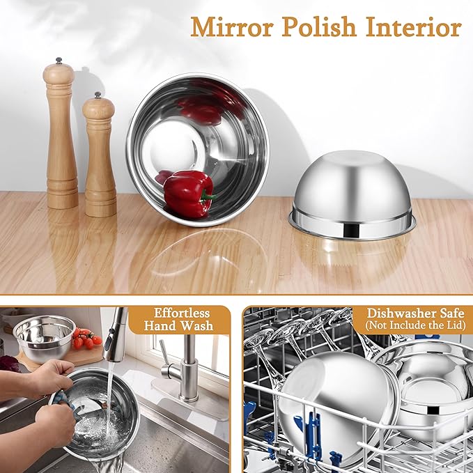 • Dishwasher Safe for Easy Cleaning: with its mirrored polished interior, these stainless steel mixing bowls can be easily cleaned by hand, and are also safe for dishwasher-safe, but it is better to hand wash the lids to prevent deformation caused by high temperature