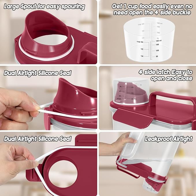 5-7Lbs Dog Cat Food Storage Container with Upgraded Large Nozzle BPA-free, 4 Snap Seals Plastic Pet Food Storage Containers with Handles (1, Elegant Red, 5L)