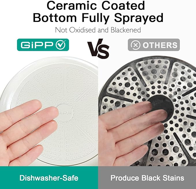 • 100% Non-Toxic & Healthy - Made with a healthy ceramic coating free from PTFE, PFAS, PFOA, PFOS, APEO, lead, cadmium and SGS Approved. GiPP ceramic Pots and Pans Set is safe for your family and the environment