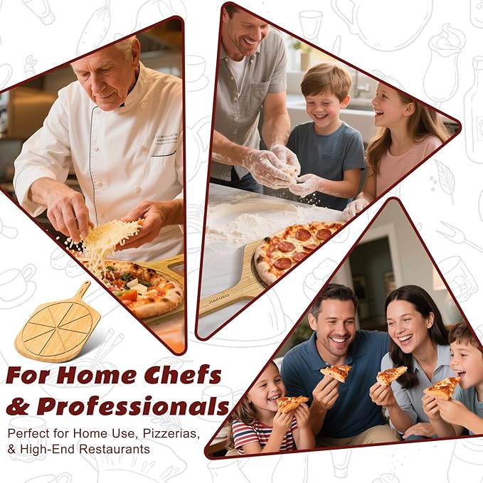 • EASY TO CLEAN AND GREAT GIFTS: The surface and edges of bamboo pizza peel are smooth, making cleaning more convenient. It is an ideal housewarming gift for family and friends. If you have any questions about our pizza cutting board for oven, please feel free to contact us.