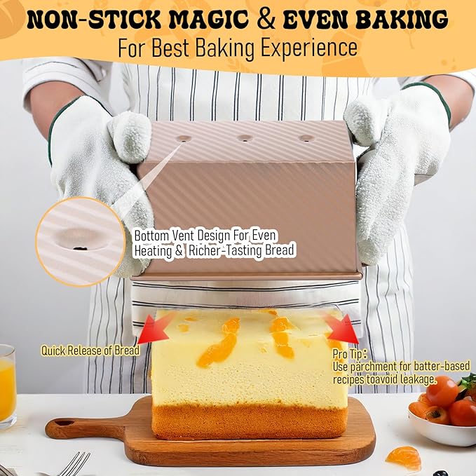 • 【Multiple Use For 1 Loaf Pan】- Whether you want to make square bread or toast bread, the loaf pan with cover can handle it easily. Flexible use of the lid according to your needs. The kind design can help get two uses of 1 pullman bread pan, which makes beautiful regular loaf bread and slices of sandwich bread.