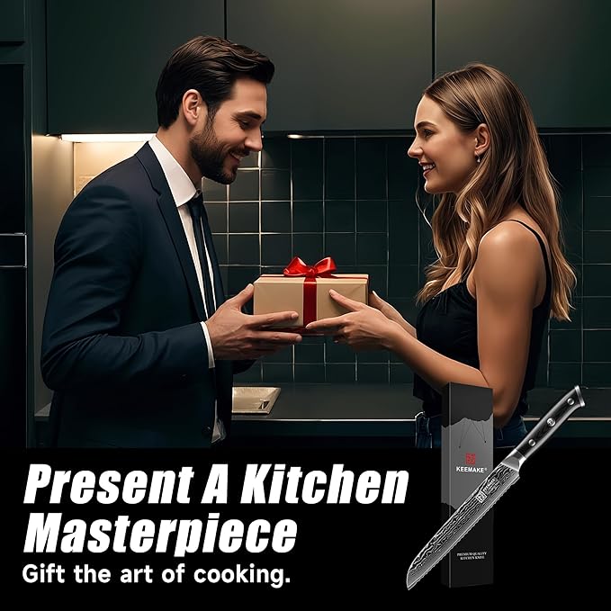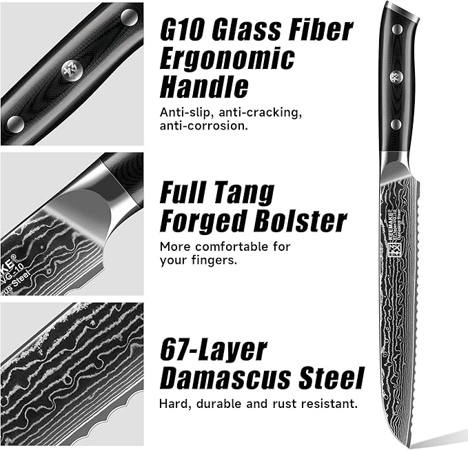 • Damascus Knife: Crafted with 67-layer Damascus steel with VG10 Japanese steel core, the 8 inch bread knife not only enhances aesthetics but also combines exceptional sharpness, durability, and corrosion resistance