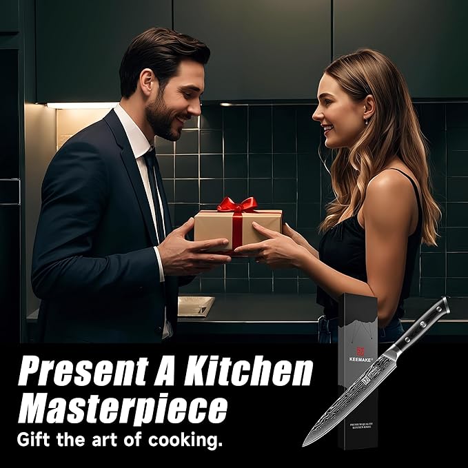 • Elegant Design: Combining striking Damascus visuals with a sleek G10 handle, the carving knife doubles as a stylish kitchen accessory, also making it a thoughtful present with elegant box for BBQ enthusiasts and culinary experts
