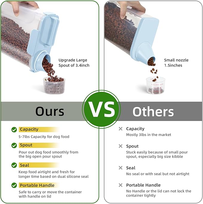 • Upgraded and Lmproved Versions:We have optimized and improved the mold the pour spout is large enough to pour out the big dog Food,You can pour out the food easy and fast now. The new upgraded Measuring Cup is also easy to screw on the spout now.The lid with snaps can also be easily closed on the barrel body.