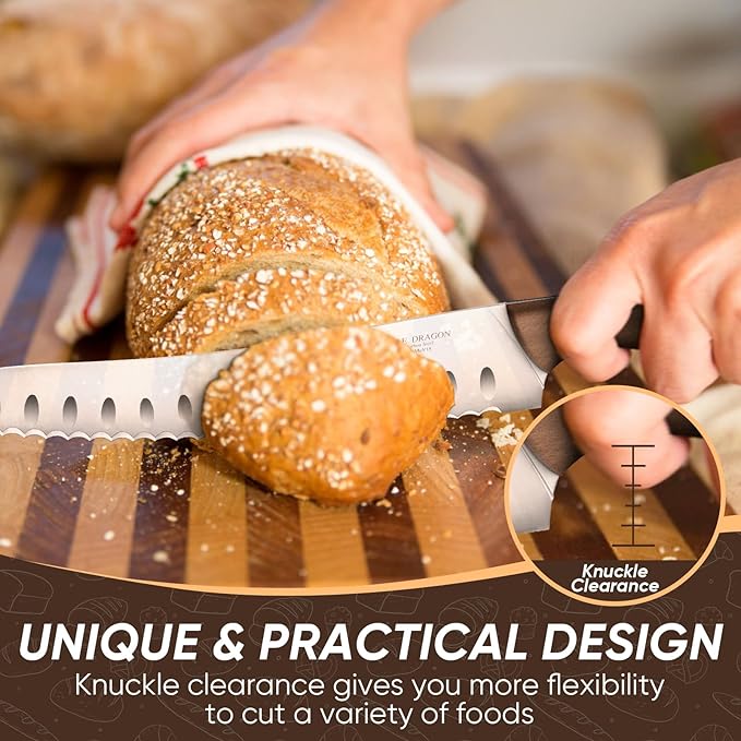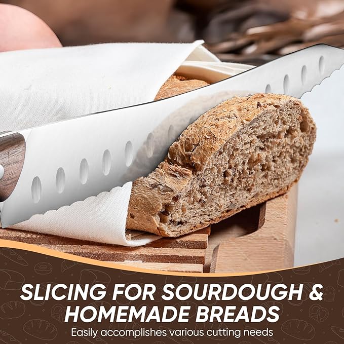 • Razor-Sharp Cutting Bread: With about 10-inch blade made from high-quality German high carbon steel, our bread knife offers exceptional durability and sharpness. Effortlessly slice through homemade bread for precise, efficient cuts every time