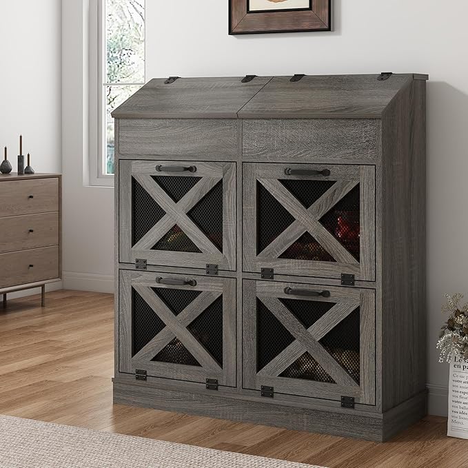Large Wood Veggie Bin for Potato,Bread,Onion With 6 Large Storage Space. Root Vegetable Storage Box For Kitchen, Farmhouse Wood Potato Box With 4 Mesh Doors,32 * 12.4 * 36IN(Grey)