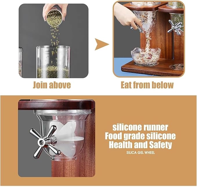 3.5L/7L/10.5L Dry Food Dispenser, Triple-Head Cereal Storage Container with PC Barrel and Wood Base for Rice, Candy, Beans, and Nuts(Double head)