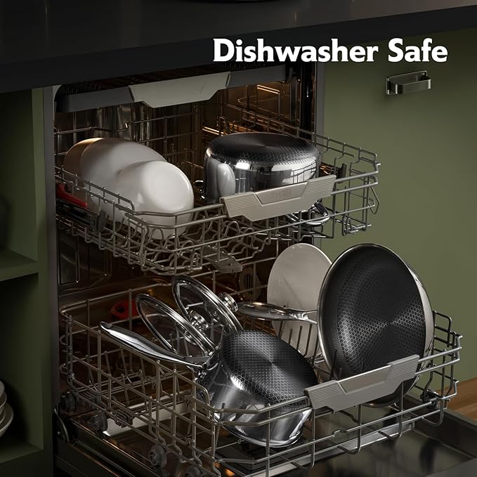 • 【Effortless Cleaning】The honeycomb-patterned coating on these pots and pans prevents food from sticking and enables quick cleaning - whether by hand or in any standard dishwasher